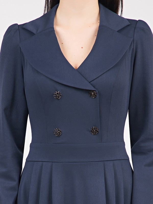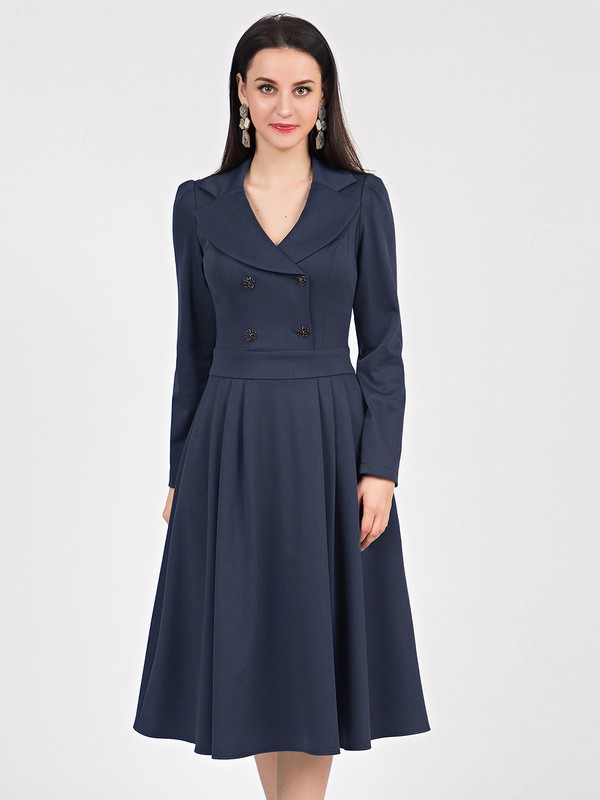 Модель для деловых встреч из плательного габардина насыщенных цветов. Платье пальтового кроя с двубортным воротником, планкой на лаконичных пуговицах и длинным рукавом. От втачного пояса ниспадает шикарная юбка со складками и функциональными карманами. Модель выполнена на вискозной подкладке. Рост модели - 170 см.