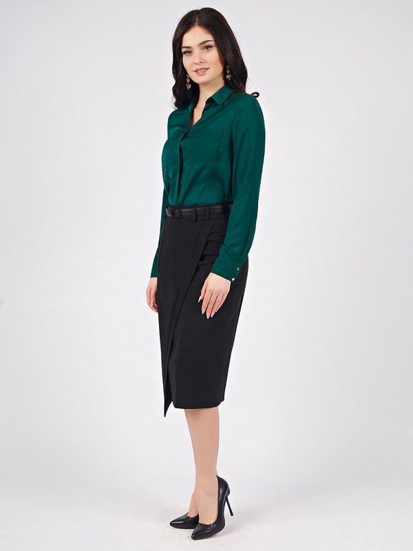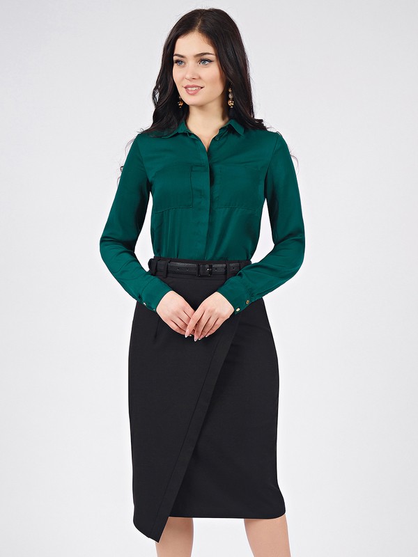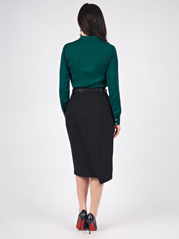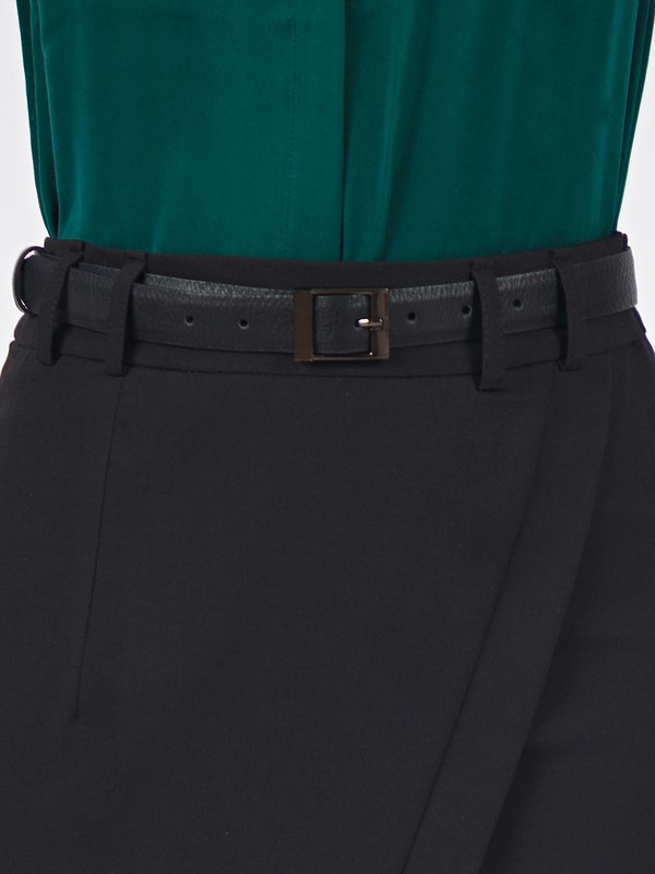 Ассиметричная юбка-карандаш на вискозной подкладке и с иммитацией запаха. Талию украшает пояс из искусственной кожи. Рост модели - 168 см.